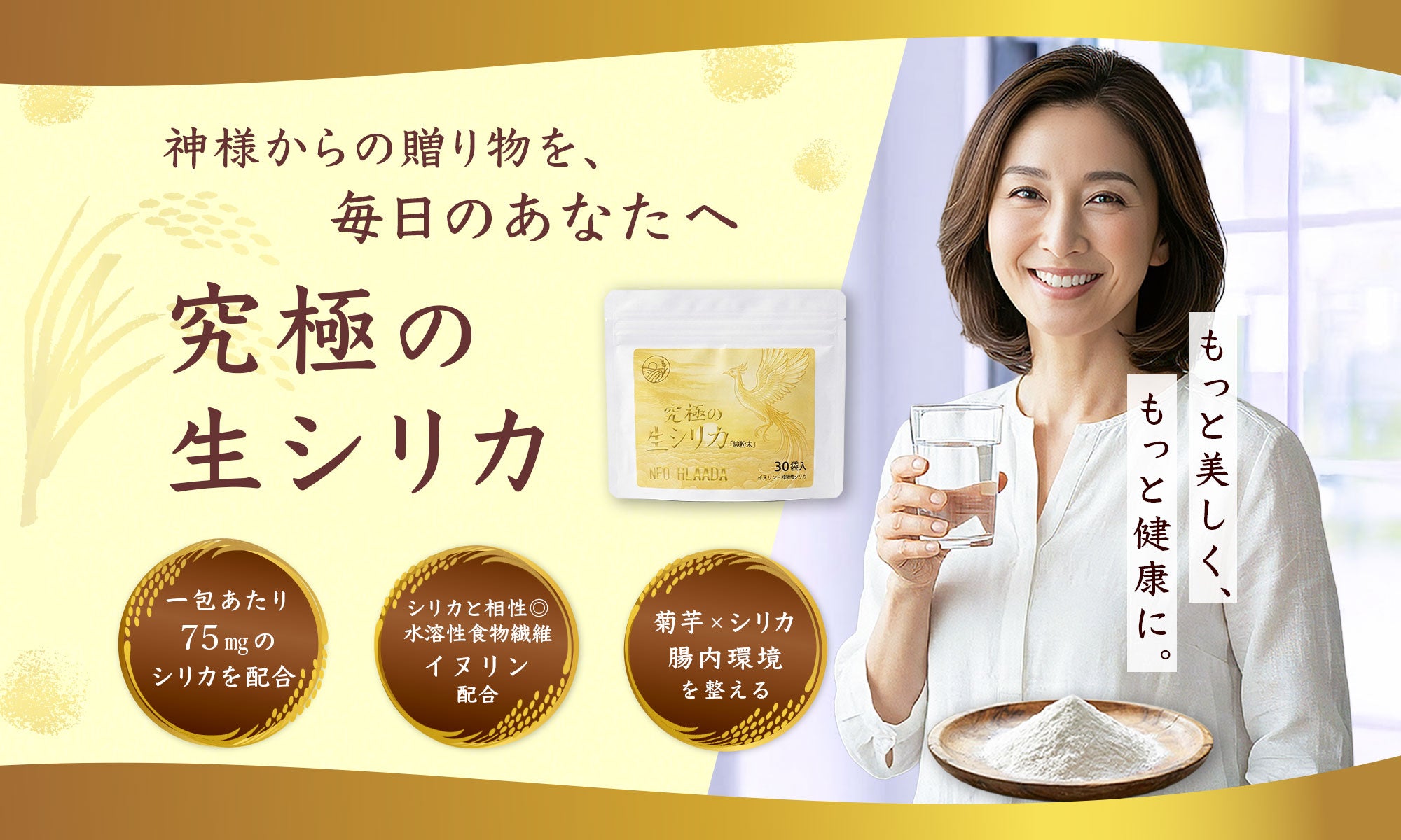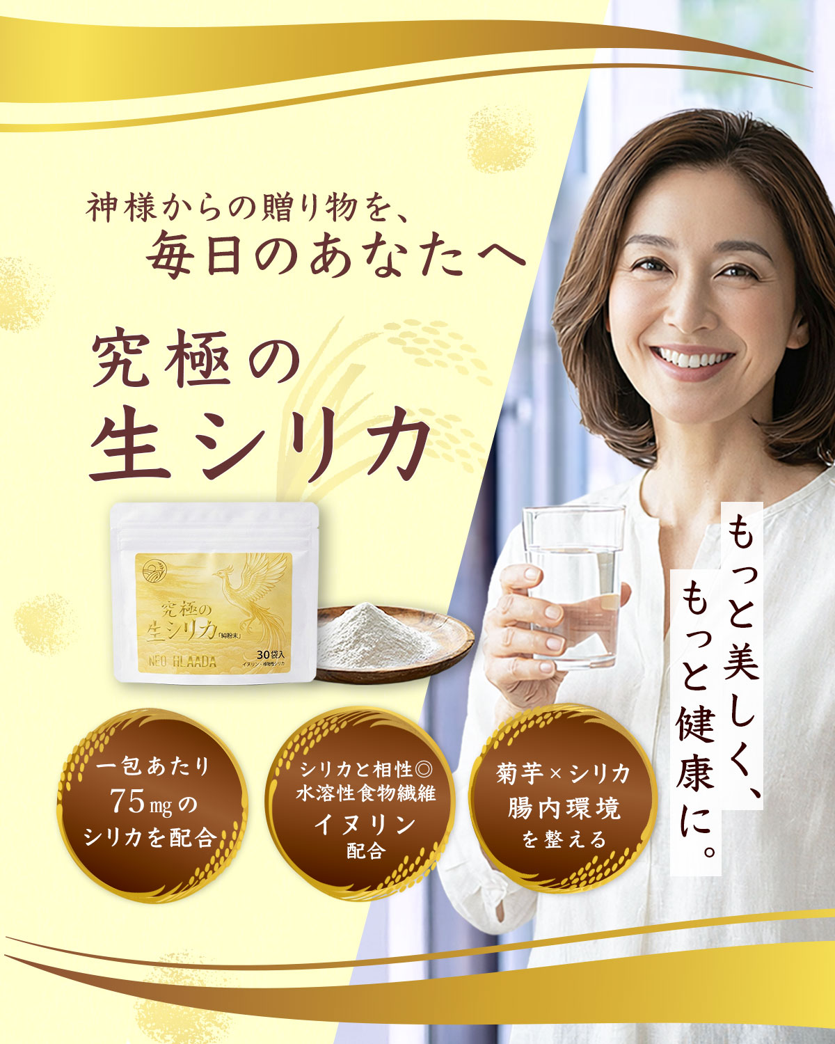 「究極の生シリカ 『純粉末』」は、無農薬稲のもみ殻から特許製法で作られた、業界最高水準の高純度を誇る100%植物性のシリカ粉末です。非結晶・水溶性のため吸収率が高く、1包で1日分(75mg)を手軽に摂取できます。無味無臭で水や料理にサッと溶け、薬品完全不使用のため、赤ちゃんからご年配の方まで安心してお使いいただけます。